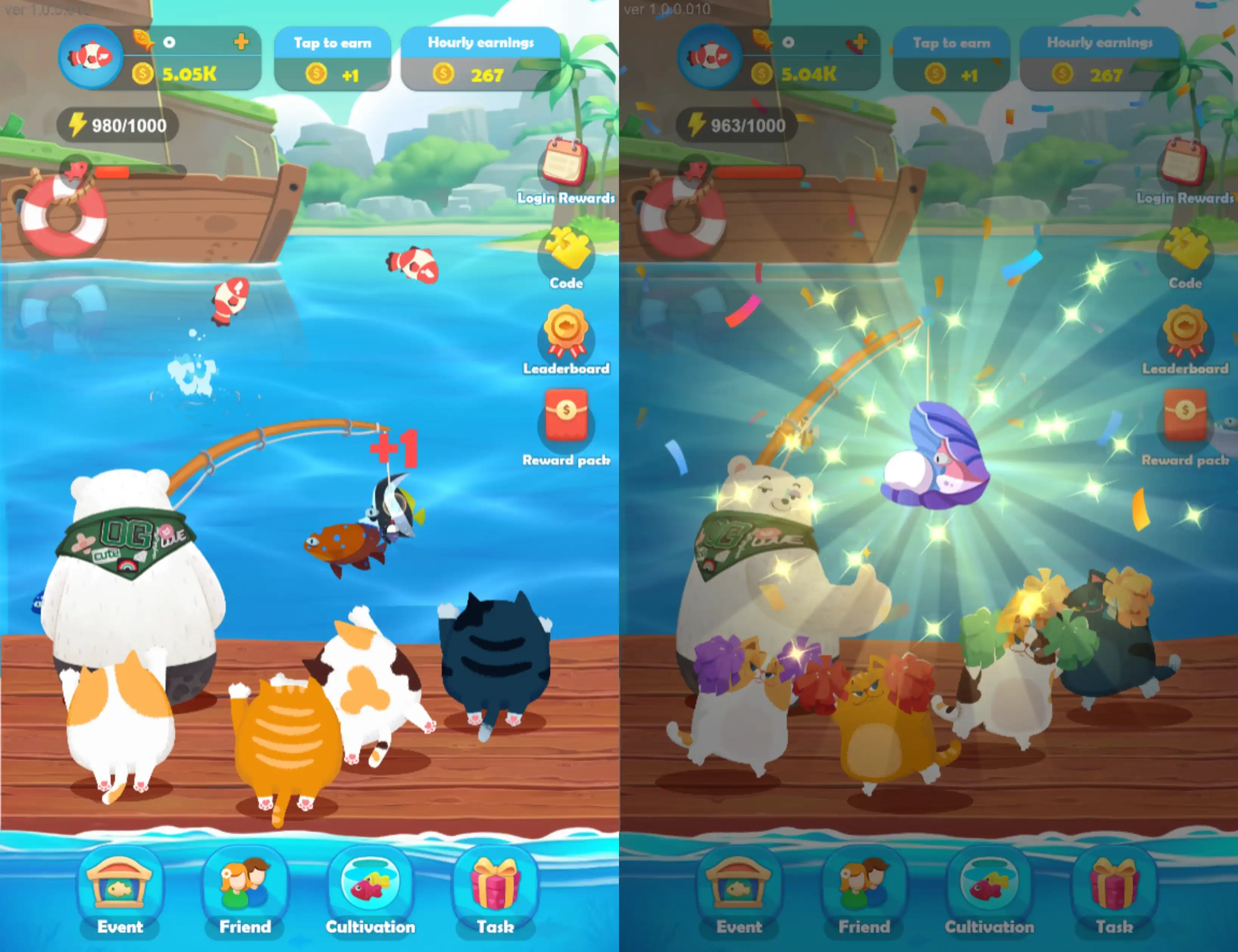 COINFISH 的游戏特色包括多种钓鱼与模拟经营模式并行,玩家无需持续在线钓鱼,通过鱼市模拟经营增加「每小时利润」参数,利用推荐系统和多样玩法增加收入。日常活动与任务系统简化了游戏过程,玩家可以轻松地每日获取奖励并与好友进行增益互动,还可以通过邀请好友参与游戏获得高额现金奖励。此外,玩家还可以创建自己的养猫圈,邀请好友共同云养猫,分享 Bonus 奖励,提升了游戏的社交性和参与度。