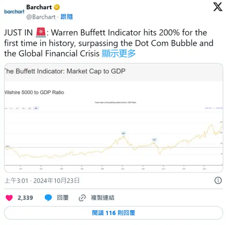 不过,面对美股目前的火热场面,@Barchart 前(23)日在推特上却提醒投资者,所谓的「巴菲特指标」近期已经**在历史上达到了 200%,超越了网路泡沫和全球金融海啸时期。