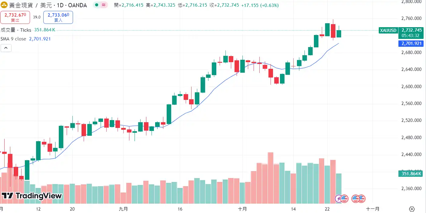 值得一提的是,长期以来被视为政治和经济不确定性对沖工具的黄金,今年至今已经上涨 32.5%,并在 10 月 23 日创下 2,758 美元每盎司的历史新高。昨(24)日略微出现回落,撰稿时报 2,733 美元每盎司。