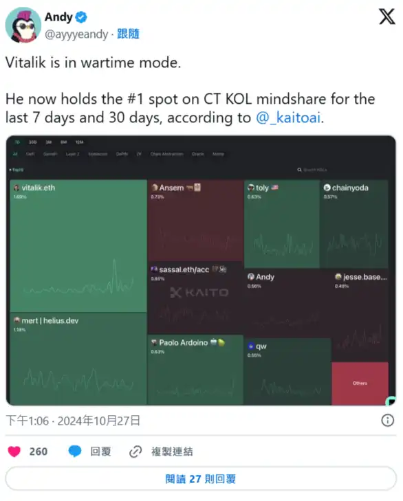 加密货币节目《The Rollup》主持人 Andy 引用 Kaito AI 数据指出,以太坊共同创办人 Vitalik Buterin 最近处于「临战模式」,他在过去七天获得**的「KOL 关注度」,达 1.69%,其次是 Helius Labs 执行长 Mert Mumtaz 的 1.18%。