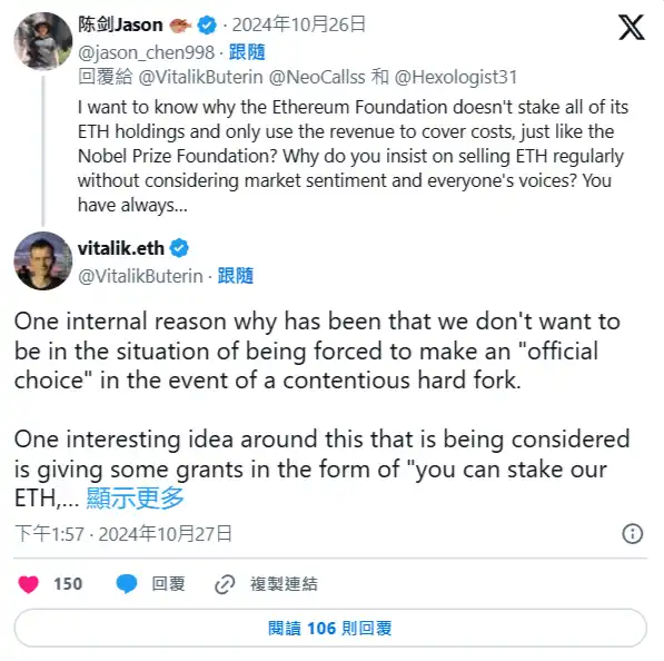 当被问及为什么以太坊基金会不将其**的 ETH 持仓用于质押,并透过质押收益来支付开销,而非直接出售 ETH 时,Vitalik Buterin 解释,以太坊基金会希望避免在有争议硬分叉发生的情况下,被迫做出「官方选择」。