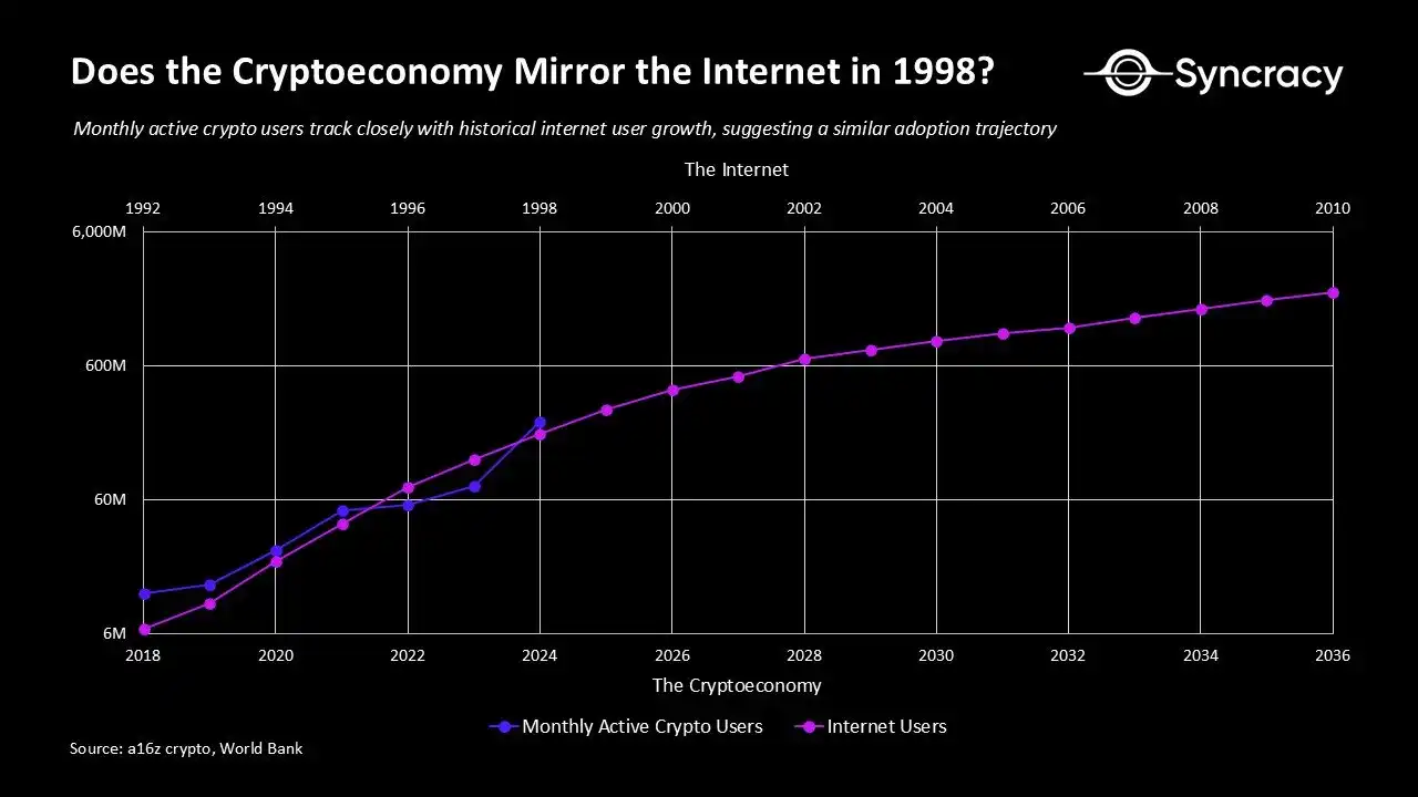 综合考虑,Syncracy 认为,资产类别开始在比特币和稳定币之间分化,而这两者正处于生产力高原上,而其他资产则充其量处于启蒙之坡。从多种采用指标来看,加密经济与 1990 年代末互联网的情况相似,当时正值互联网泡沫期间——在这一阶段,互联网的革命潜力显而易见,但估值却达到了天文数字,且并不存在评估互联网公司的基本框架。