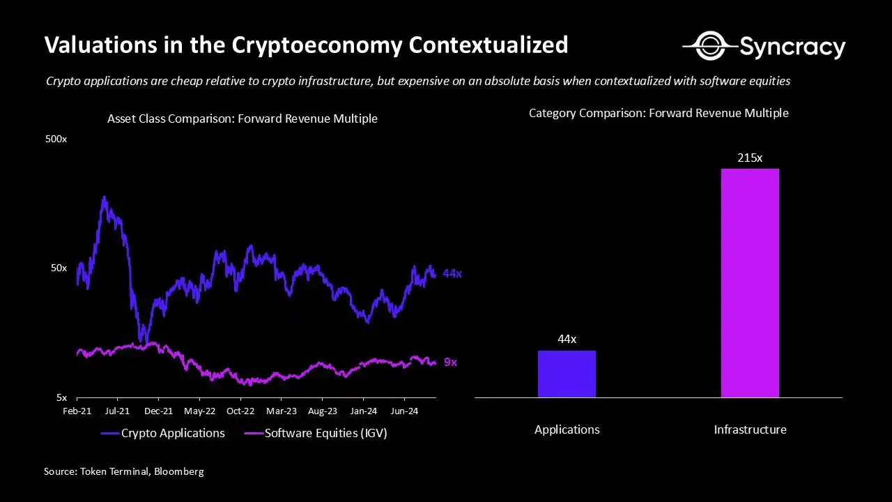 尽管一些独具特色的项目在与传统股票的对比中,交易的估值相对合理,但整体而言,这些项目仍需成长以匹配其估值。虽然有令人信服的理由相信,这些应用在长期内被低估,尤其是与交易在约 200 倍更高倍数的非货币区块链基础设施相比,但目前尚不清楚是否有**紧迫感需要在**基础上建立多头头寸。