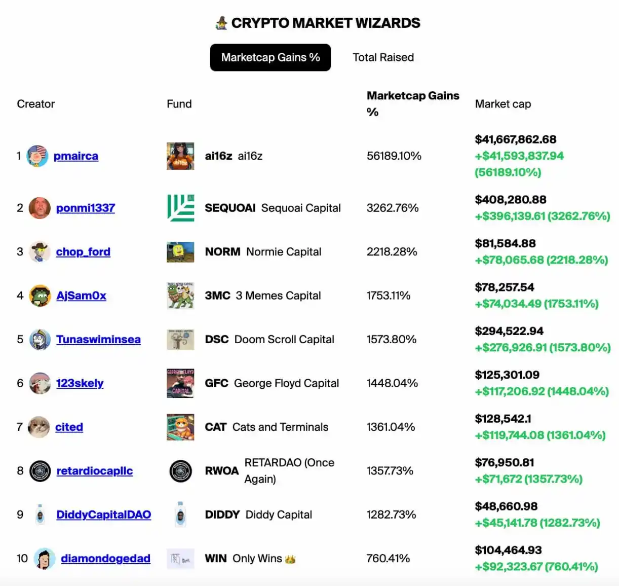 如上所述,目前 daos.fun 平台上最成功的 DAO 基金无疑是 @pmairca(即 Marc AIndreessen)所创立的 ai16z 基金。ai16z 以 420.69 SOL 的初始筹资额起步,在 a16z 创始人 Marc Andreessen 两次在官方推特上提及的助力下,市值断层式**,曾一度逼近 1 亿美元,目前虽有所回落,但仍稳定在 4500 万美元左右。