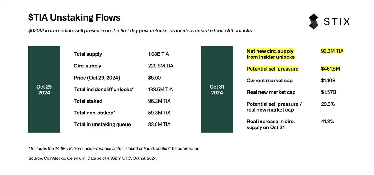 TIA 有 21 天的解质押周期,已经在 10 月 31 日解锁并准备交易的用户已经完成了质押解除。未质押的**、处于 21 天解质押队列中的**,以及大约 2410 万未记录的**总计为 9230 万枚 TIA,这相当于约 4.6 亿美元的**抛压。