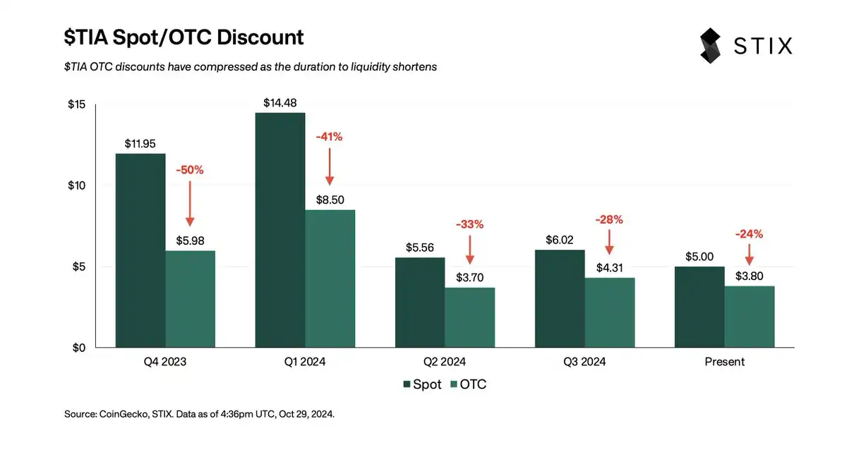 在 2024 年**季度,牛市已成熟,TIA 上涨至 20 美元以上,但此时场**易活动较少,因为卖家不愿接受 40% 以上的折扣,而买家也不愿出价高于 8.5 美元上限。我们几乎没有看到交易活动,卖家们「感觉」自己财力丰厚,宁愿保持风险敞口,尽管当时有机会实现 100 至 800 倍的投资回报。
