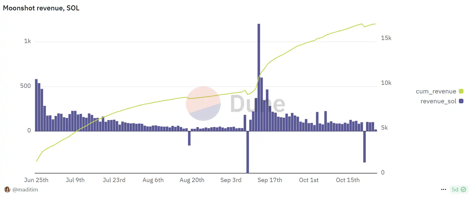 除了 Pump.fun 之外,还有同样出圈的 moonshot 作为流动性的大水闸。随着 Murad 在 Token2049 大会上发表其「memecoin supercycle」的演讲,Moonshot 也伴随着 MOODENG 开始出圈。Moonshot 不仅上币效应极强,成为链上的「币安」,其法币入金更是开启了新的 Mass Adoption 风口,为加密创造了 Web2 流量的增长。在 9 月末,Moonshot 的日费用快速从 3681 美元左右涨至 2.4 万美元,日交易用户从 396 名增长至 3458 名。其累计也在稳步抬升,甚至其斜率有加速趋势。Moonshot 的成功进一步聚集了链上的流动性。