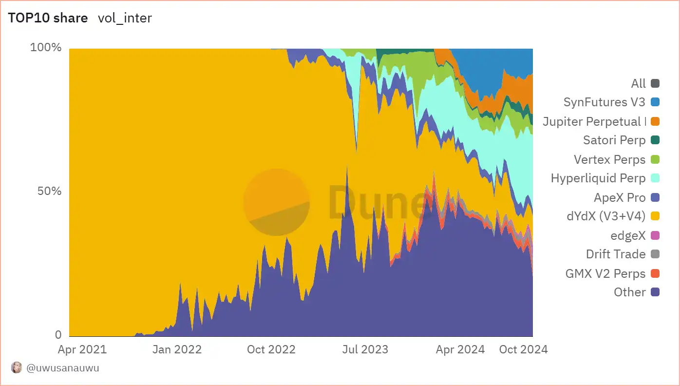 Crypto 的市场千变万化,还没有发币的 Hyperliquid 悄然接过了 Dydx 的龙头位置。