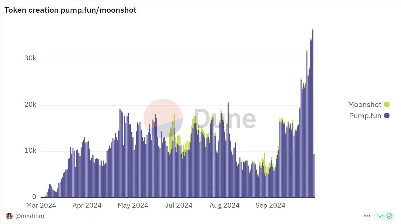 除了金狗们的出现,更能直接反应链**动性增幅夸张的是 meme 类基建的数据。例如人尽皆知的 Pump.fun,其上币数量在 8 月末便开始了自己的「主升浪」,上币数量不断创新高。表明现在的 Crypto native 用户对链上 meme 抱有极大的热情,也反应了市场流动性在链上 meme 的集中。