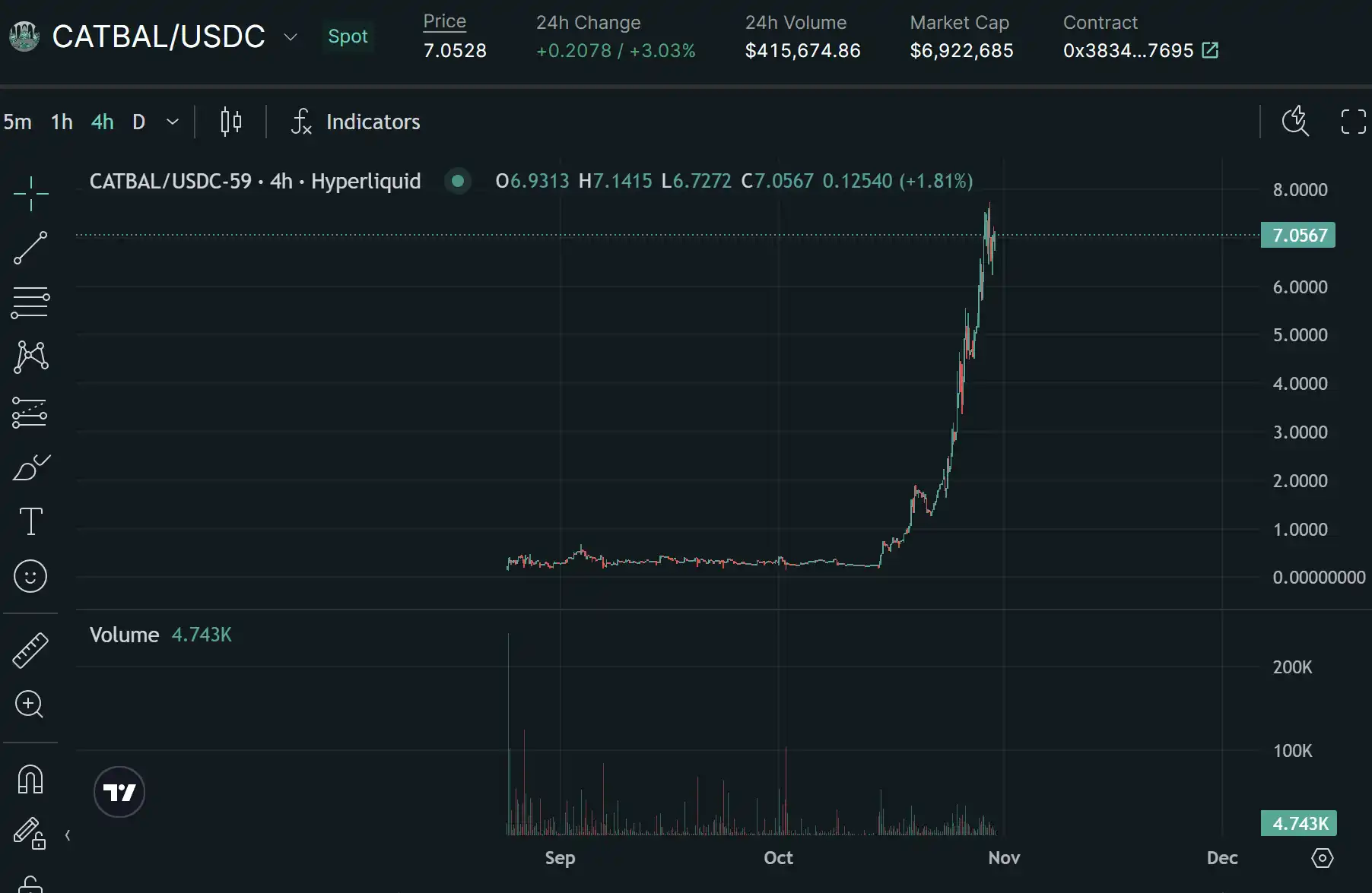 Hyperliquid 生态中以猫类别的 meme,以神秘猫为 meme 传播的热点,目前关注人数较少,但是价格走势强势。在 10 月 15 日开始上涨,目前已经实现 30 倍左右额涨幅,市值达到 692 万美元。