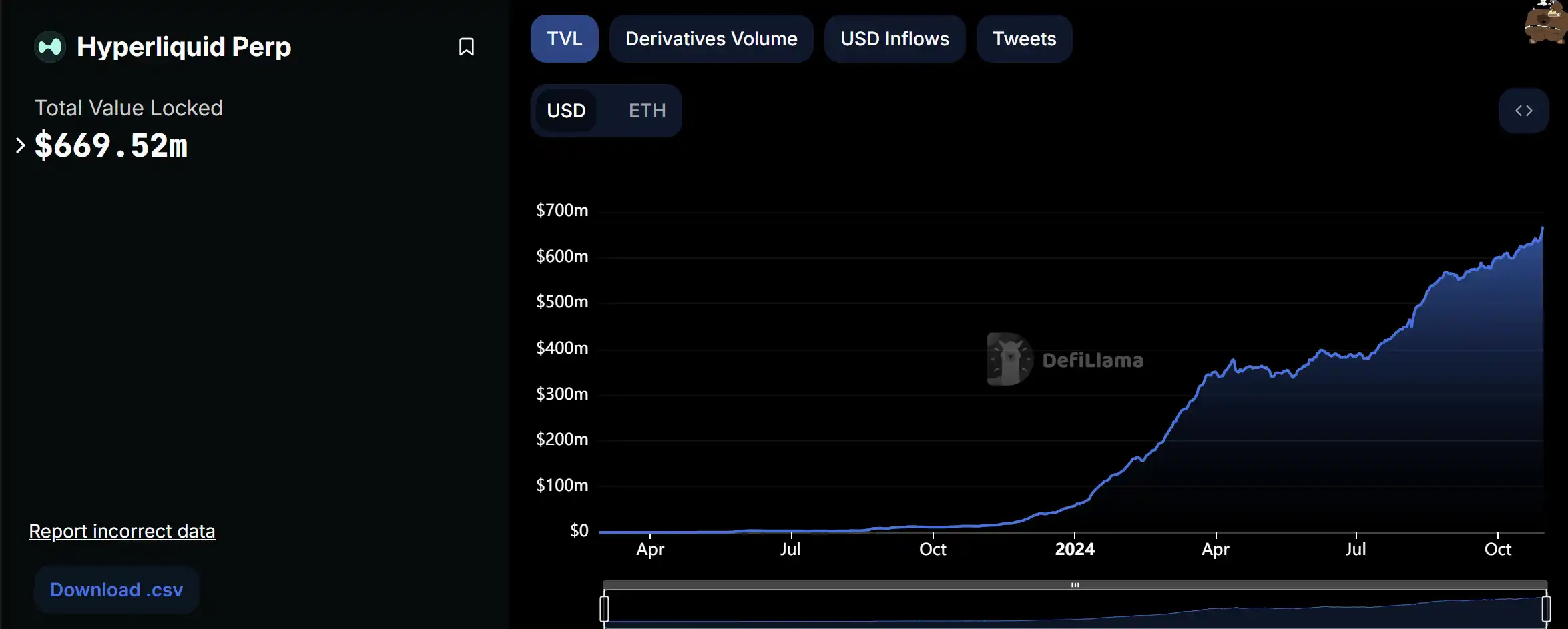 根据 Dune 显示,在近 3 个月以来,Hyperliquid 实现了后来者居上,已经成为市占率**的 perp DEX,占据市场份额的 40% 成为当之无愧的龙头。其 TVL 也在今年开始爆发式的增长,如今已经达到接近 6.7 亿美元的级别。
