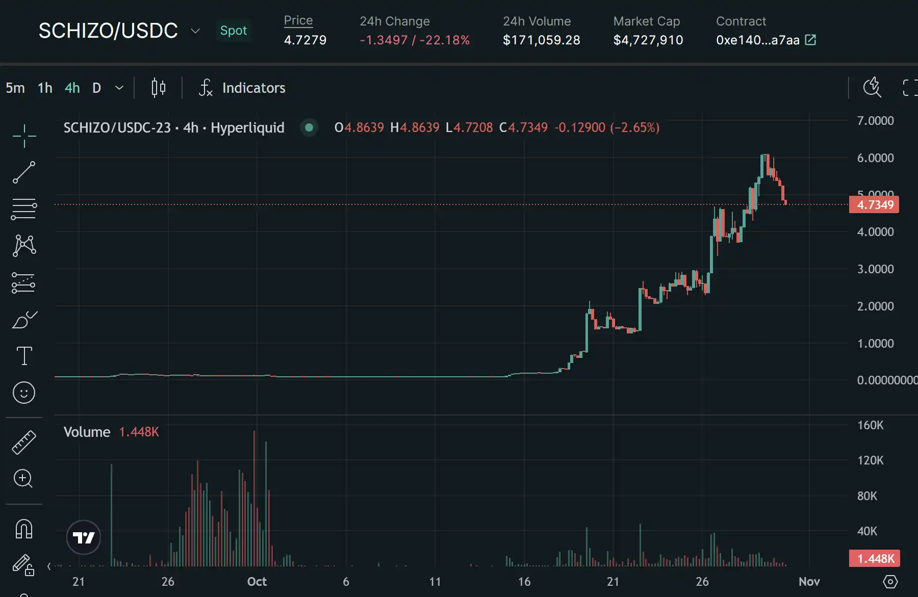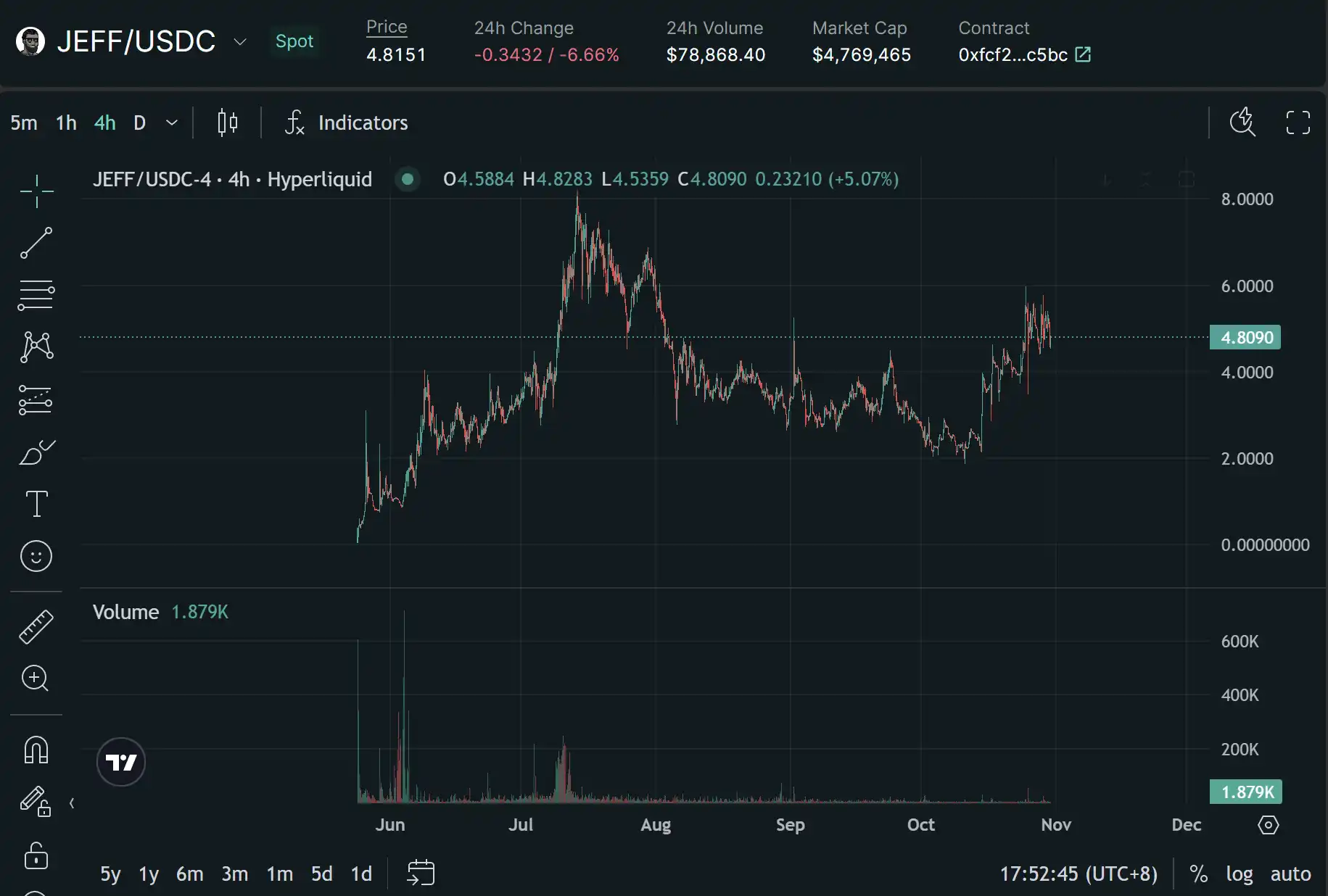 JEFF 是 Solana 上人物类型的 meme,也是 Hyperliquid 上市值最被低估的 meme 现货**。JEFF 没有如其他 meme 的百倍涨幅那么夸张,但是其市值为 476 万,依然具有上涨空间。目前价格在 4.8 美元附件徘徊,具有冲击新高的潜力。