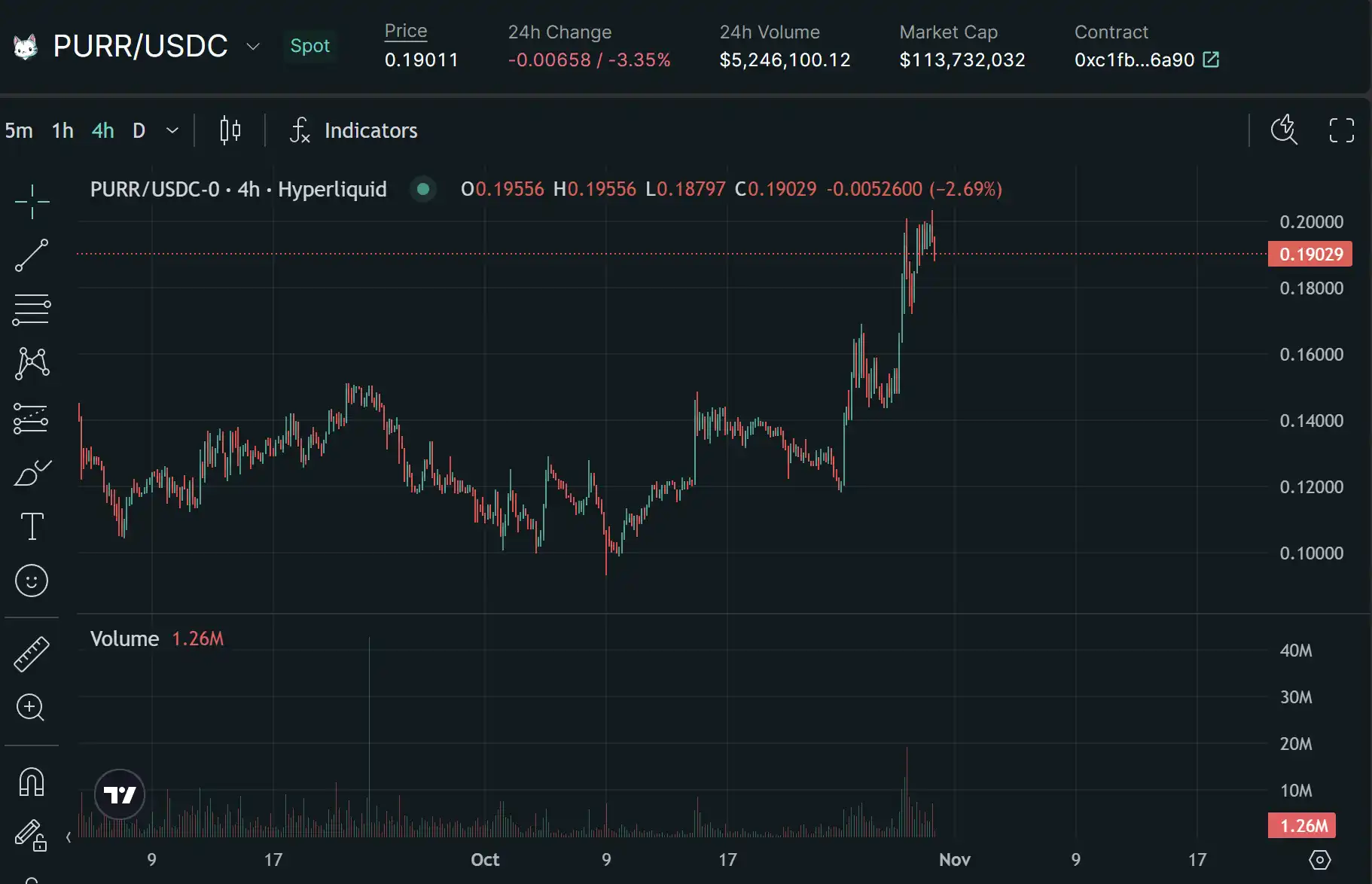 Hyperliquid 在现货功能推出时给平台早期用户空投了 MEME 币 – PURR,同时是 Hyperliquid **个上线的现货**。目前价格走势强势,从 10 月初至今接近翻倍。