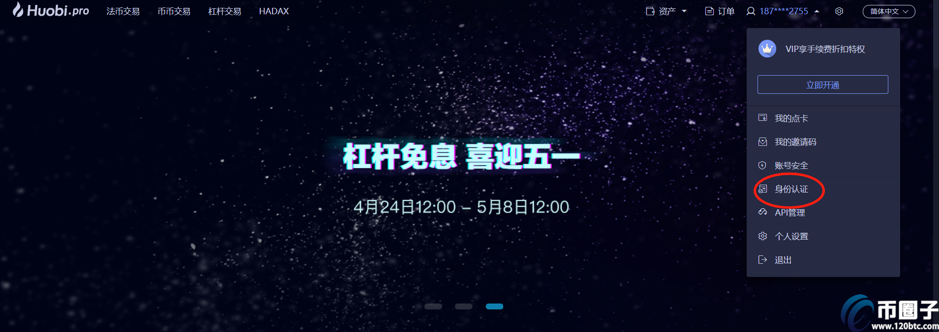 1.点击首页右上角自己的账户位置,点击“身份认证”。