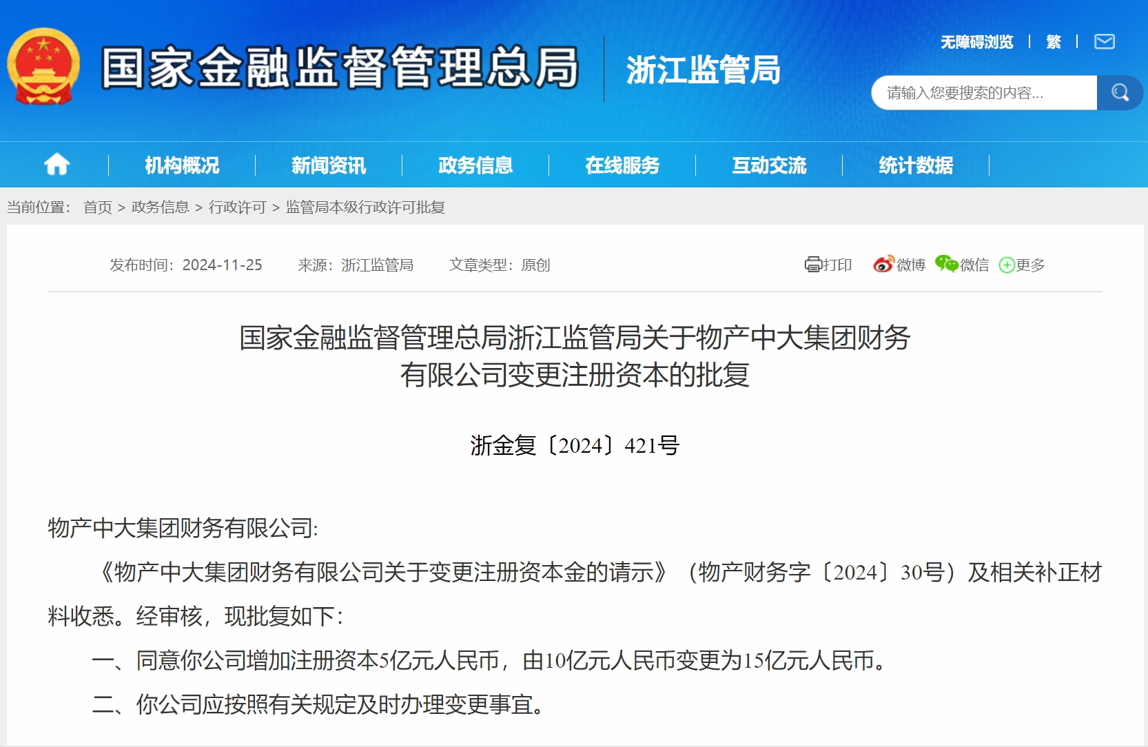 财经11月26日讯 昨日,**金融监督管理总局浙江监管局公布相关批复,同意物产中大集团财务有限公司(简称:物产中大集团财务公司增加注册资本5亿元人民币,由10亿元人民币变更为15亿元人民币。以下是相关批复正文: