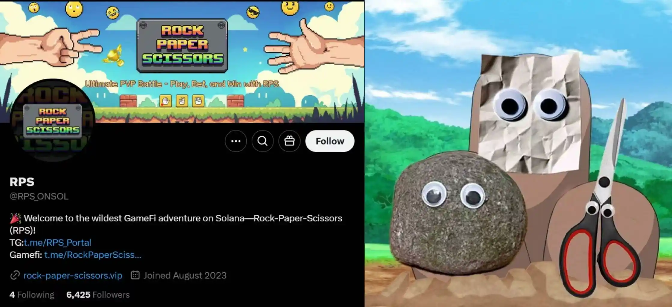 Rps 名字的灵感来自大家熟悉的游戏「石头剪刀布」,也就是 Rocky、Papery、Scissory 的缩写。**属于 Solana 区块链上的一款 PVP(玩家对战玩家)游戏,进入一个**的 GameFi 世界,可以在游戏中和其他玩家对战,边玩边赚,市值五个小时冲击 480M,爆拉 500 倍的涨幅。