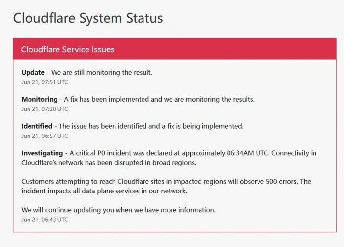 互联网基础设施企业 Cloudflare 刚刚宣布,其已修复周二早些时候的“大范围”服务中断问题。故障发生约一小时后,以 Zerodha、Medium、Register、Groww、Buffer、iSpirt、Upstox 和 Social Blade 为代表的网站,已经陆续重新上线。但是包括 FTX、Discord、Omegle、DoorDash、Crunchyroll、Feedly 等在内的许多网站和服务,还是不可避免地受到了本次中断的影响。