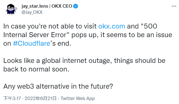 一度在过去 24 小时内达成 14.7 亿美元交易量的 OKX,其**执行官在网站受到 Cloudflare 服务问题打击后,更是询问是否要转向未来的 Web3 替代解决方案。