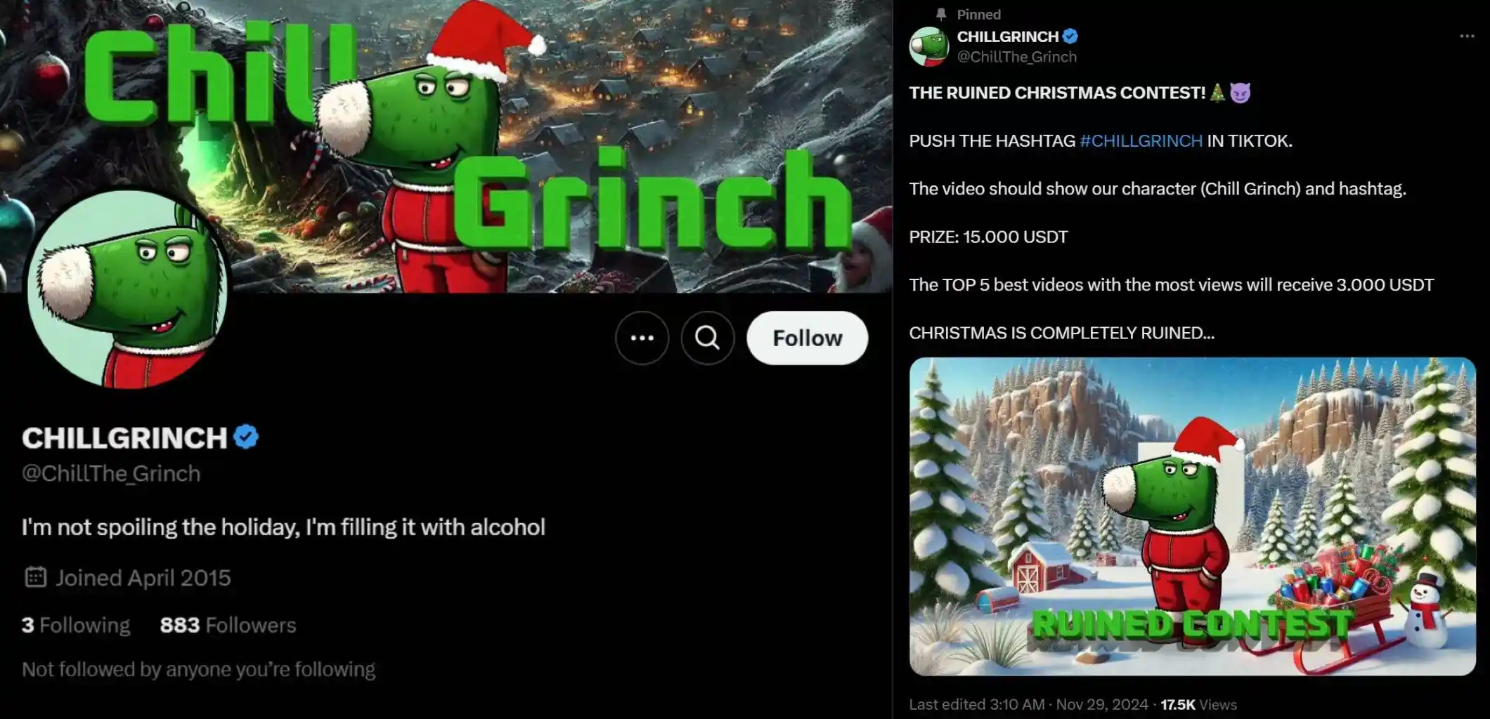 Chill Grinch 属于是圣诞主题文化 Chill GUY,最近 Chill GUY 在 tiktok 等平台不断的引流所以热度一直很高,在加上圣诞节的特征是个很好的结合了当下热点的叙事。