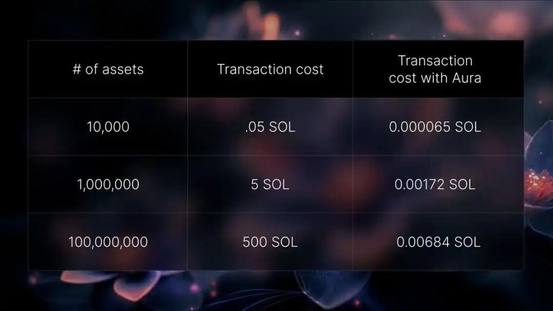此外,9 月 Metaplex 基金会官宣推出了 Metaplex Aura——为 Solana 和 SVM 服务的去**化索引与数据可用性网络(测试网)。通过 Aura 所提供的索引和数据可用**,让 Solana 和 其他采用 SVM 标准的区块链项目可以更**地读取资产数据,以更低的成本支持批量操作,将其操作的成本** 99% 以上,如下图: