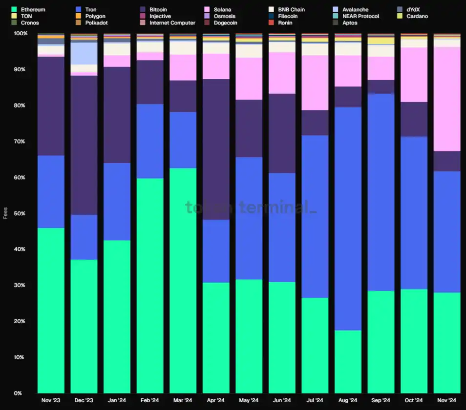 L1 月度 Fee 收入市场份额占比,数据来源:tokenterminal