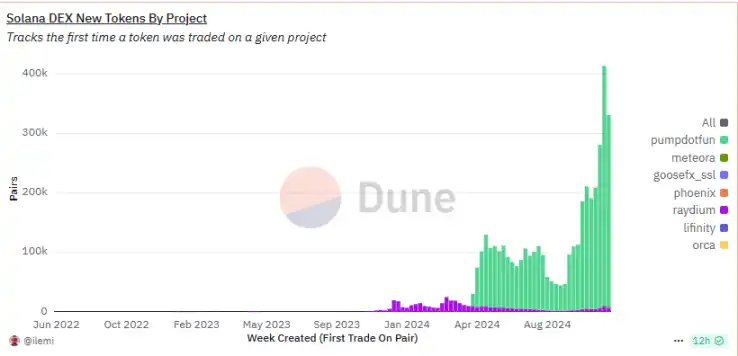 Solana Dex 每周新增的**品种数量,来源:Dune