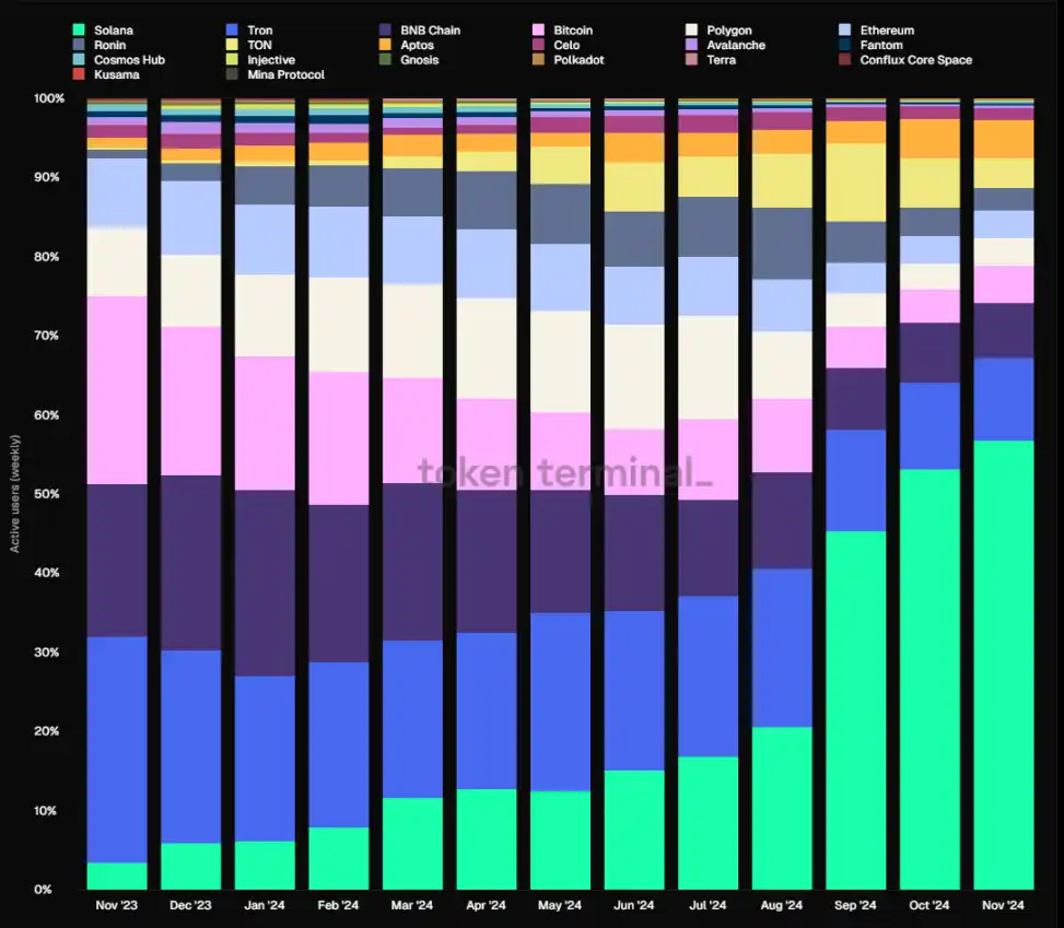 活跃地址数:Solana 的活跃地址数份额从 3.48% 增长至 56.83%,同比增长 1533%;