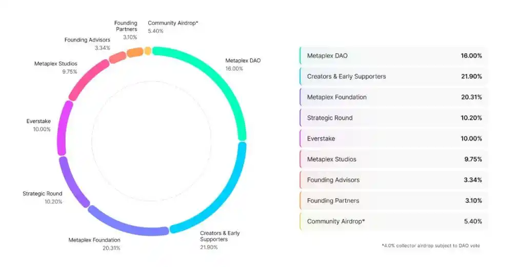 · Metaplex DAO 16%,无锁定,根据 DAO 提案分发;