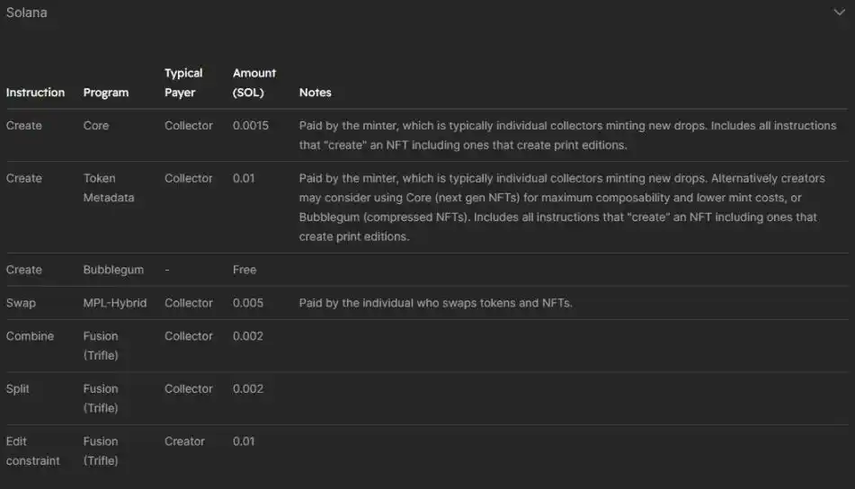 具体来说,Metaplex 产品在 Solana 上的收费标准如下: