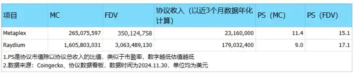 从协议收入和协议的市值对比来看,Metaplex 的估值更高一些。