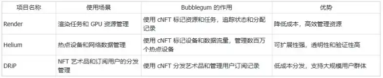 Bubblegum 是 Metaplex 用于创建和管理压缩 NFT(cNFT)的程序。通过压缩技术,创作者能够以极低的成本铸造大量 NFT,1 亿个 NFT 的铸造成本仅需 500 SOL( 相比传统铸造方式实现了超过 99% 的成本**),提供了前所未有的扩展性和灵活性,也正是由于 Bubblegum 技术的推出,大规模低成本的 NFT 铸造成为可能,Render、Helium 在内的 DePIN 项目才开始迁移到 Solana,也催生了 DRiP 这样创新的 NFT 平台,以下表格是这三个代表对 Bubblegum 的应用实例列举。