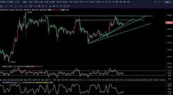 我们从四小时去分析,上方压制位分别是 244和 249,下方压制位分别为238 235.5 和230附近,从趋势线我们可以发现的低点在不断抬高,虽说没有突破新高,目前可以说和空头处于一个僵持的状态,指标上分析,RSI三线粘合,向上发散,stochrsi指标触底反弹,我建议做多就好了。