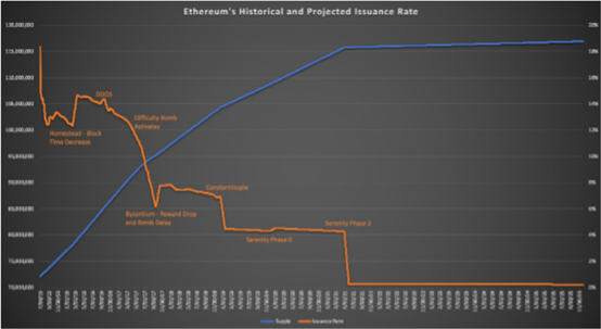 一开始,7200 万 ETH 被创建并分发给公众、以太坊基金会和开发商。以太坊配备了抑制通胀的机制,以控制新 ETH 发行率,目前的上限是每年新增 1600 万 ETH。这背后的考虑是防止任意创造货币,导致恶性通货**或操纵。