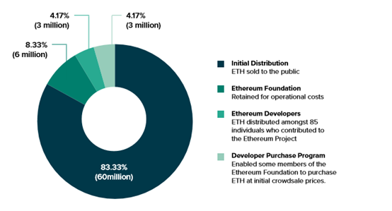 在 2015 年 7 月 30 日网络启动时,根据 2014 年 7 月至 8 月期间进行的****中筹集的约 1800 万美元,创建并分配了 7200 万 ETH。在网络启动的同时,决定解散 EthSuisse,并将以太坊基金会指定为致力于加速采用和使用的**组织。