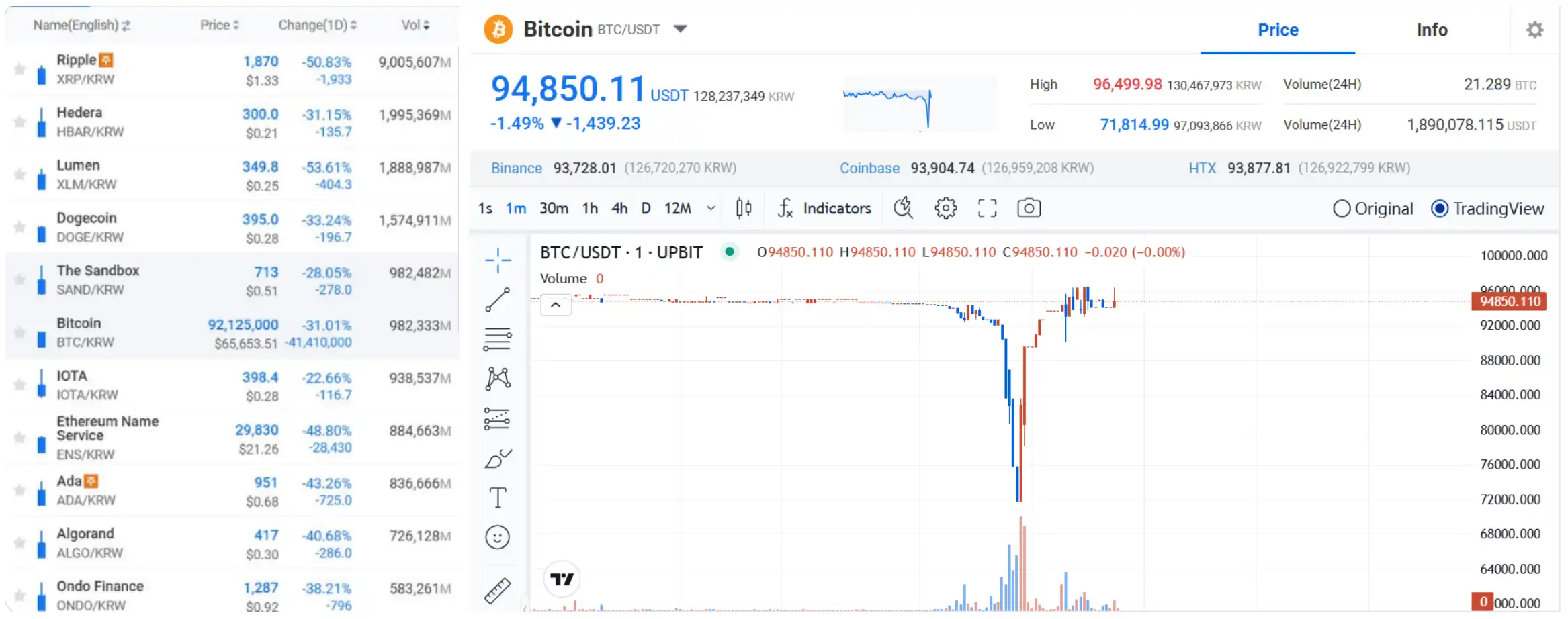 Upbit 上比特币价格曾一度「插针」至 71,814 美元
