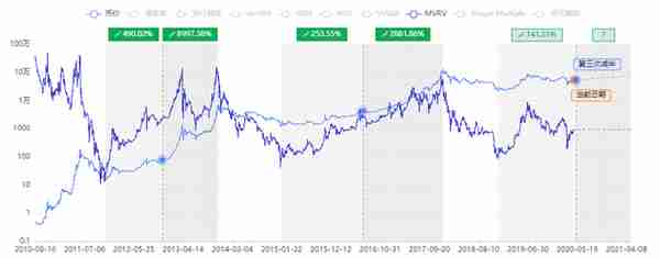 **个周期期间,特别是在2011年6月牛市之前,MVRV表现极不稳定,大体维持在2-8之间。这是比特币市场早期不成熟的一种表现,一方面市场炒作投机比例大,另一方面是很多链上移动的比特币也表现出极大的不稳定,包括其中有很多比特币可能在此期间发生丢失。随着比特币价格快速下行,MVRV也出现大幅回落,**降至历史**点0.4。