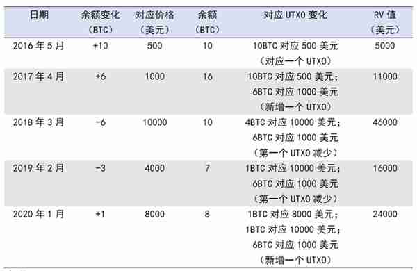 举个例子。截至今日,某比特币钱包余额,在2016年5月、2017年4月、2018年3月、2019年2月、2020年1月发生了五笔转入或转出,对应金额分别是 10BTC、 6BTC、-3BTC、-5BTC、 1BTC。则该钱包内所有BTC的RV计算值如下表: