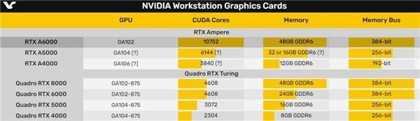 早在去年三季度,NV就发布了基于30系列安培架构的**专业卡“RTX A6000”,这是一颗基于GA102完整核心研发的产品,搭载了48GB的 GDDR6显存,并且拥有最多4个DP 1.4输出接口,当然,售价也是不菲的,售价约为5.5万美元。