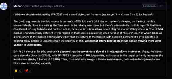 目前的限制允许每个区块目标为三个blob,最多为六个blob。布特林正在推动将每个区块的blob数量增加到四个,最多八个,以便让第二层(L2)协议在以太坊区块链上存储更多数据。