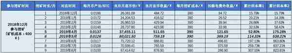 2、累计回本率 1 和累计回本率 2 两种算法的差异在于 1 是按照在每个月月底把当月的币产出按市场价卖掉(数据来源 Coinmarketcap,美元/人民币汇率按 7 计算);2 则是累计到计算回本率的当月月底卖出得到;