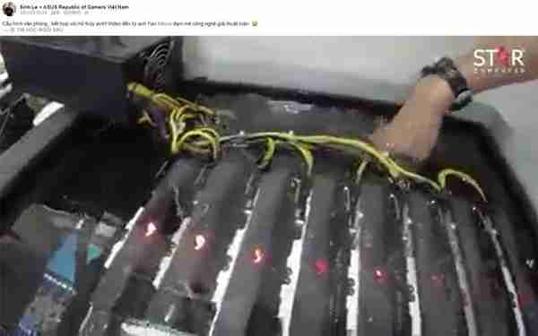 了解到,一名越南玩家也展示了全油冷散热矿机。他使用了 8 块华硕 ROG 系列 RTX 显卡,但具体型号未知。这名玩家将除了电源外的整个矿机浸入矿物油中,保证了绝缘性能。此种方式尽管比较罕见,但是也能够提供充足的散热能力。