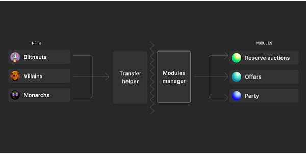 ZORA V3 使用允许 Zora DAO 部署新市场类型和更新版本的架构。市场模块的每个部署版本都是无需许可的,**不能更改,但 DAO 可以将模块部署到 Zora 的批准空间中。这有助于开发人员选择他们使用的模块并轻松使用新版本而无需**迁移(就像我们从 V2 到 V3 所做的那样),并**了需要花费的总 gas。