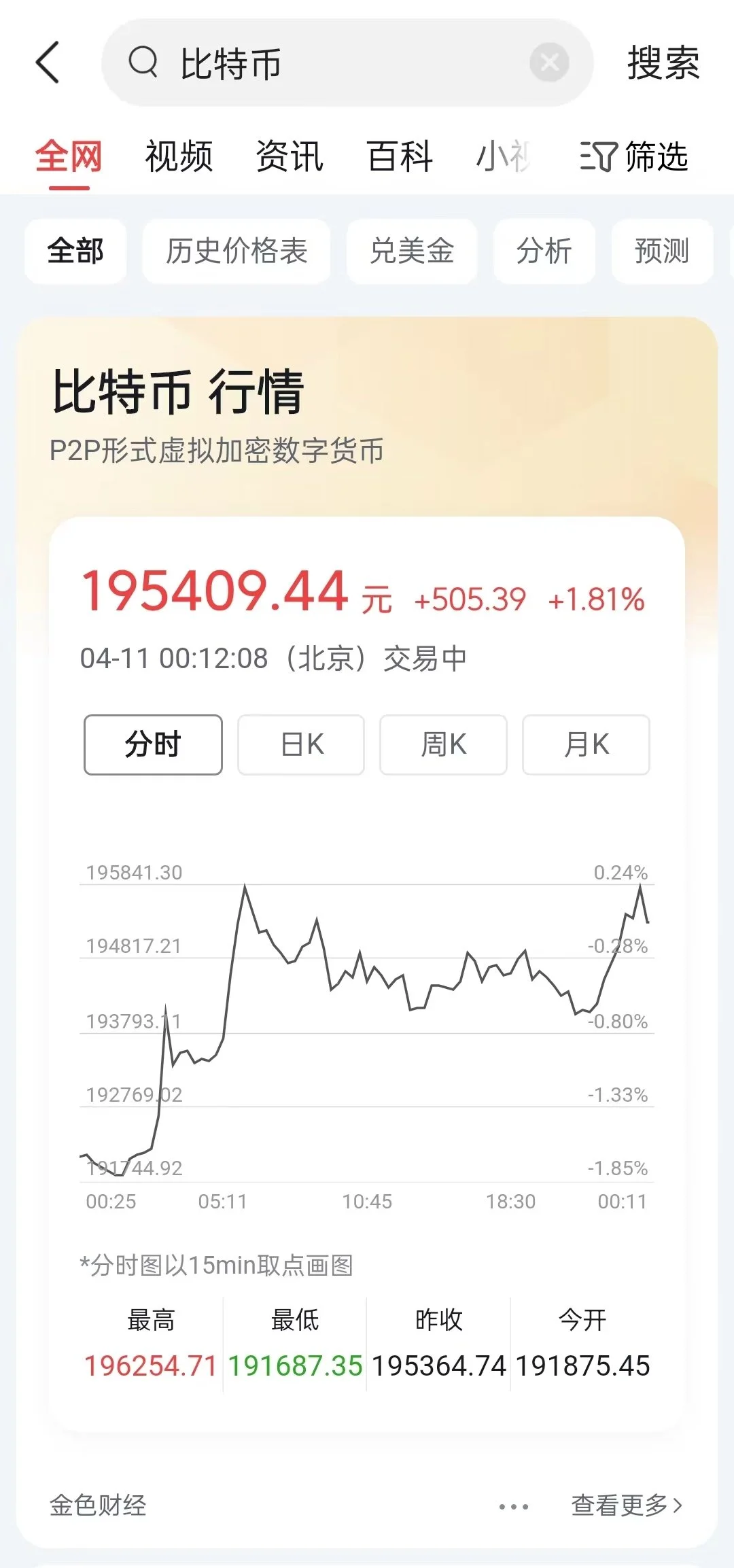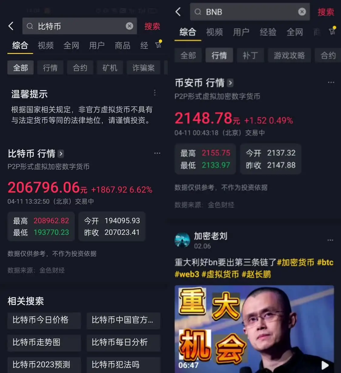 抖音APP内搜索后可显示比特币、以太坊、莱特币、瑞波币等个别主流虚拟货币的行情,甚至还有全球**虚拟货币交易所Binance推出的平台币(BNB),并且为人民币计价。抖音显示数据来源为金色财经,其为一区块链垂直资讯平台。同一时间观察者网在今日头条APP搜索发现,平台内也可实现比特币价格的查询。