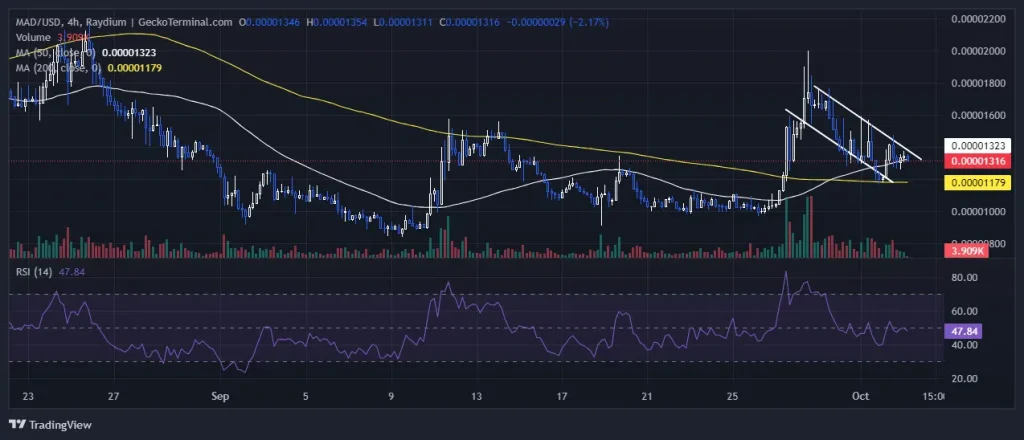 如果下降通道模式继续下去,MAD 价格可能会进一步下跌,下一个可能的支撑位为0.000010 美元。