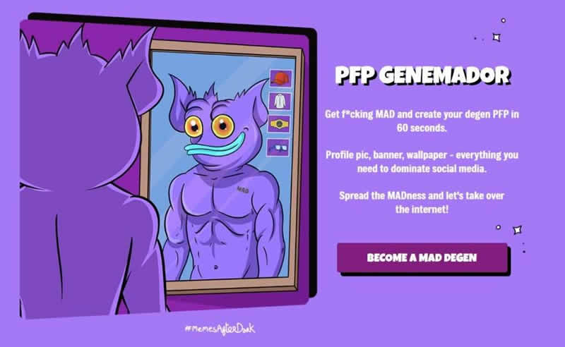 PFP GENEMADOR 是MAD 生态系统中的个人资料图片生成器。有了这个,您可以在60 秒内创建PFP 照片、横幅、桌布等。