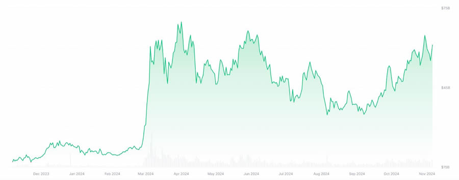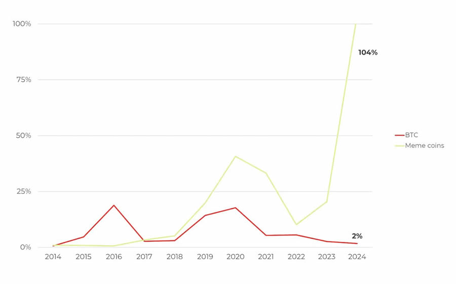 截至2024年11月,模因币市场 热度飙升,波动性加剧,市值达到近700亿美元,接近历史**值。模因币的灵感往往来自网络文化,因其病毒式的传播能力和投机性而备受关注,仅**季度就增长了近170%。这些**大多于2024年推出,一年之内涌现出的项目占现有项目的75%。
