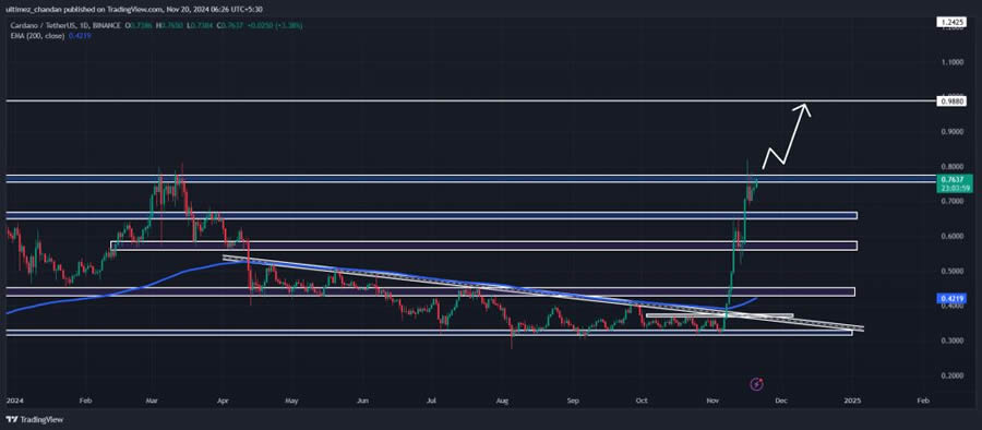 从基本面看,随着比特币(BTC)达到94,000 美元的里程碑,进一步激发了加密货币爱好者的乐观情绪,因此,ADA 币可能会追随比特币、瑞波币等**加密货币的势头,飙升30 % 以上。