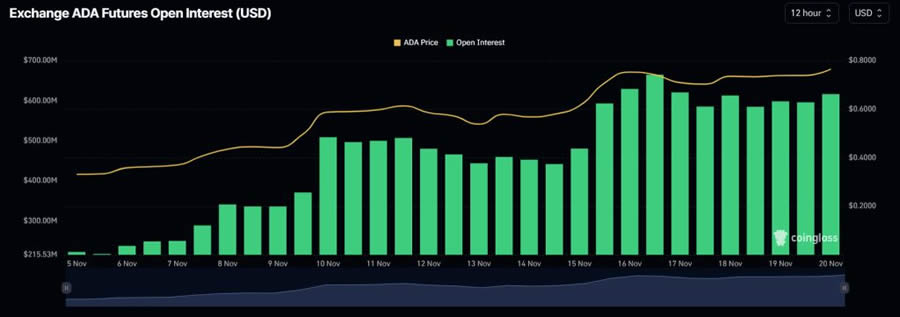 根据Coinglass 的数据,ADA 的未平仓合约(OI)在过去四个小时内增加了5.90%,在过去一个小时内增加了3.80%。 OI 的显著上升表示交易者活动加剧,显示看涨情绪中积极参与。