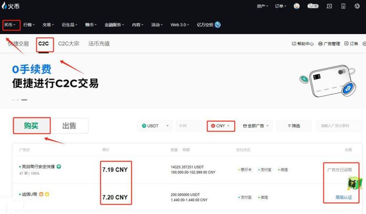 2、进行身份认证后,可在“买币”——“快捷交易”——“C2C”处进行交易,注意法币选择“CNY”,选择好商家进行交易即可