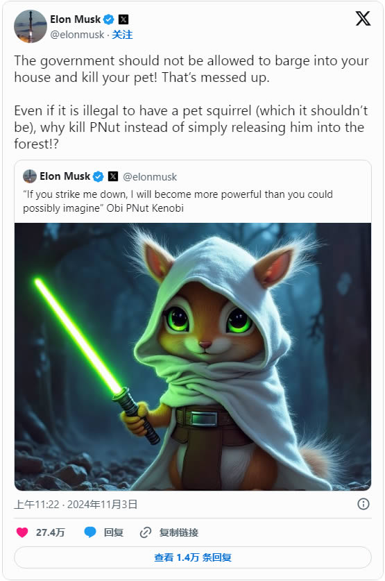 于是 Mark Longo 在社媒上发起请·愿书,并有数万粉丝签名参与。可惜 Peanut **还是被 DEC 处以安乐死。在 Peanut 安乐死后,Dogecoin 发文谴责民·主·党,马斯克也为发文悼念 Pnut 并宣称**上台会拯救 Peanut。